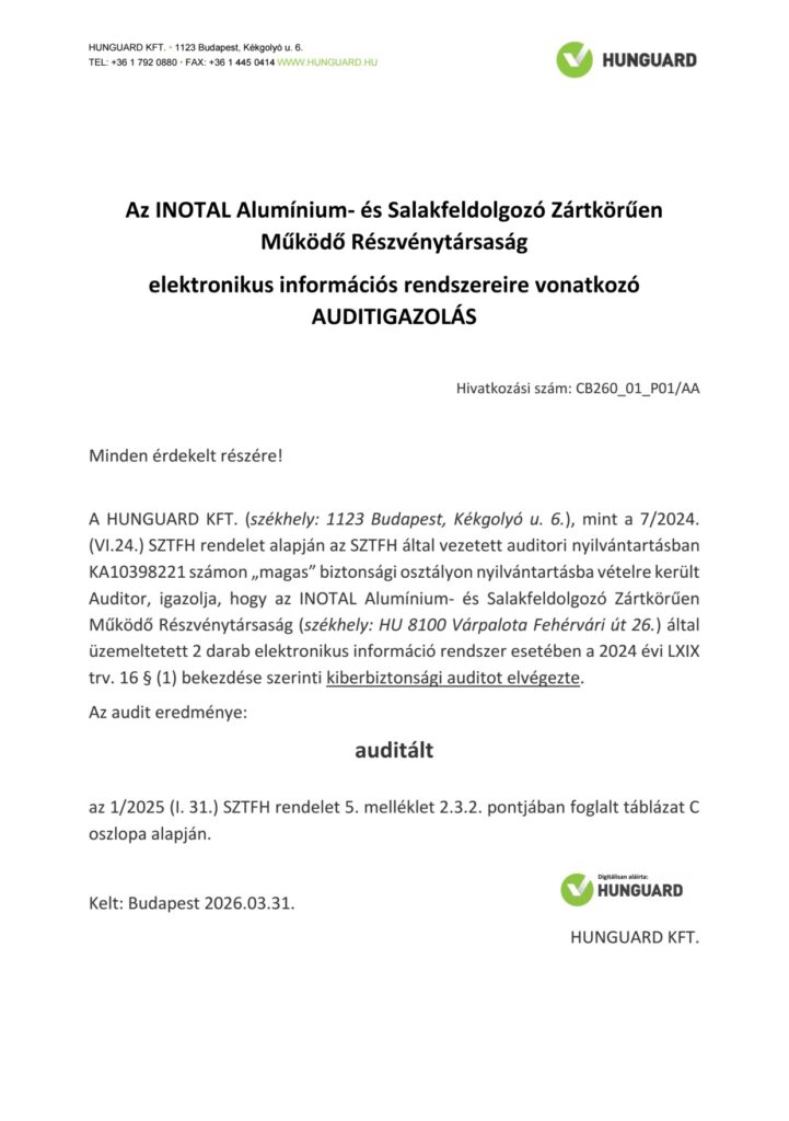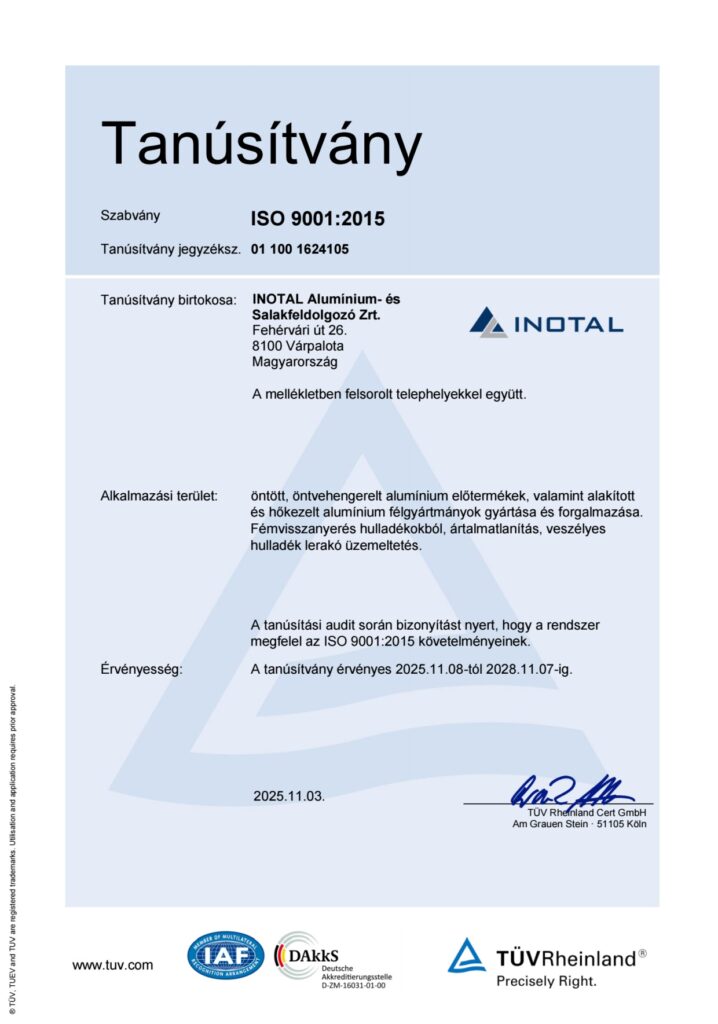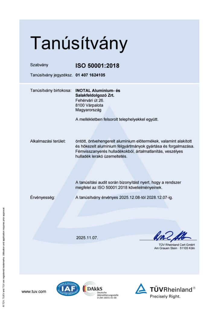 Az INOTAL Zrt. 2007-től öntött, öntvehengerelt alumínium előtermékek, valamint alakított és hőkezelt alumínium félgyártmányok gyártása, értékesítése tevékenységi területén működtet kombinált menedzsment rendszert. A kialakított rendszer megfelel az ISO 9001, ISO 14001 és ISO 50001 szabvány mindenkori követelményeinek. A követelményeknek való megfelelést a TÜV CERT ellenőrzi tanúsító, felügyeleti és megújító auditokkal.